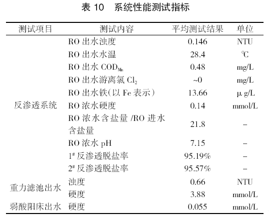 (1)反渗透的回收率和脱盐率。从以上表看出,回收率实现了95%,脱盐率为95%左右,实现了设计目标。
