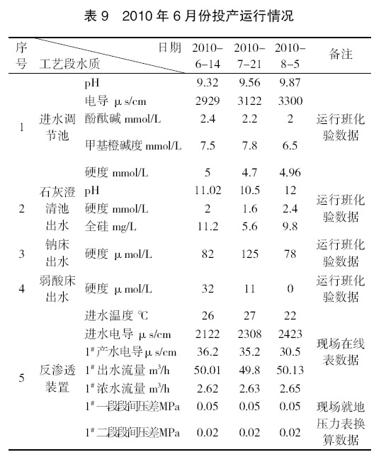 (2)反渗透的稳定运行。该项目采用了美国海德能公司的宽流道抗污染型PROC-10S反渗透膜元件,反渗透进水pH值维持在8~9之间,反渗透装置的段间压差、产水水量、水质等均维持基本稳定。