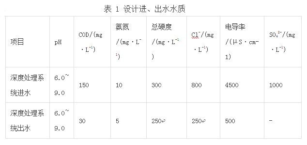 目前對于焦化廢水的深度處理工藝主要有生化法、物理吸附法、化學(xué)絮凝法、高級氧化法、膜分離法等組合工藝〔5〕,從實驗結(jié)果及工程實踐來看各有利弊。筆者根據(jù)進水水質(zhì)及出水水質(zhì)要求,確定該廢水主要特征為COD、硬度、含鹽量比較高,所以處理該廢水適合采用膜分離法處理工藝。由于納濾技術(shù)在去除水中二價鹽和硬度方面有較大優(yōu)勢,因此采用超濾+納濾+反滲透為核心的全膜法處理工藝。