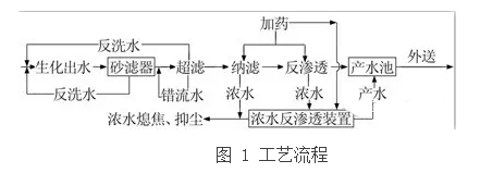 生化系統(tǒng)出水進入深度處理系統(tǒng)調(diào)節(jié)池,調(diào)節(jié)水質(zhì)和水量后經(jīng)泵提升進入砂濾設(shè)備去除懸浮物,產(chǎn)水進入砂濾產(chǎn)水池。砂濾產(chǎn)水提升后經(jīng)過自清洗過濾器進入超濾設(shè)備去除膠體等污染物,超濾產(chǎn)水進入超濾產(chǎn)水池。在超濾產(chǎn)水提升的同時投加還原劑、阻垢劑、非氧化性殺菌劑,經(jīng)過高壓泵增壓進入納濾系統(tǒng)去除硬度、二價鹽離子等污染物,納濾產(chǎn)水進入納濾產(chǎn)水池。在納濾產(chǎn)水提升的同時投加阻垢劑、非氧化殺菌劑,經(jīng)高壓泵增壓后進入反滲透系統(tǒng)進一步去除離子等污染物,反滲透產(chǎn)水進入回用水池待用。砂濾、超濾反洗水經(jīng)反洗水池調(diào)節(jié)后進入生化系統(tǒng)混凝反應(yīng)池,在系統(tǒng)內(nèi)循環(huán)處理。為提高系統(tǒng)回收率,對反滲透濃水進行二次過濾,進一步減少系統(tǒng)外排水量。