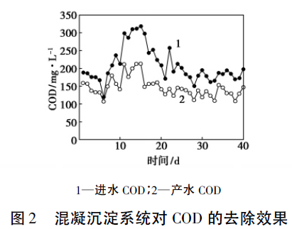 未经处理的焦化废水COD 一般在2 500 ~3 500 mg /L,经“A2 /O”工艺处理后,二沉池产水COD 可降低到150 ~ 300 mg /L。采用混凝沉淀技术处理二沉池产水,该工艺对COD 的去除效果如图2所示,废水中COD 的去除率在15% ~ 50% 浮动,且产水COD 随进水水质的变化而波动。分析COD 去除率差异较大的原因,可能是由于二沉池进水流量不稳所造成。当二沉池进水流量过大,超过二沉池的处理负荷时,会减少悬浮物的沉降时间并增加水体的扰动程度,阻碍悬浮物的充分沉降,从而造成水流夹带部分悬浮物进入混凝沉淀系统,造成系统进水COD 波动较大,并进一步造成COD 去除率的波动。