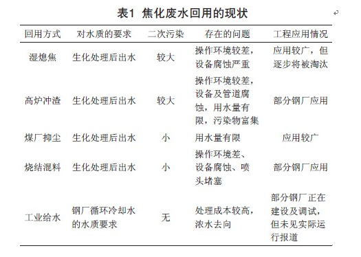 随着国家节能减排政策的提出,国内焦化厂对焦化废水的回用进行了很多探索和尝试。主要回用方式包括湿熄焦、高炉冲渣、煤场抑尘用水、烧结混料用水,也有厂家用反渗透技术将焦化废水处理后回用作为工业给水。表1是国内焦化废水回用的一些基本情况。