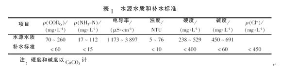 采用某市政污水厂二级排放水为电厂唯一生产水源,根据GB50050—2007《工业循环冷却水处理设计规范》确定该循环冷却塔的补水控制标准,水源水质和补水标准如表1所示。