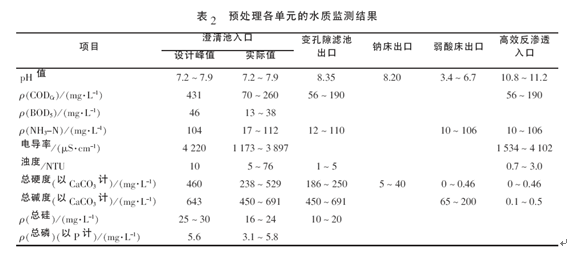 污水处理厂出水水质不能达到二级排放标准的要求,并且波动较大,特别是冬季,水质更为恶劣,因此反渗透的预处理系统是保障整个系统稳定运行的关键。预处理系统各单元的水质监测结果如表2所示。