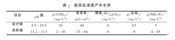 高效反渗透系统产水水质如表3所示。由表3可知,反渗透系统产水pH值及NH3-N浓度比原设计值高,但对将其作为循环冷却水系统的部分补充水及对于后续的锅炉补给水处理系统并没有太大的影响,可以满足生产的需要。