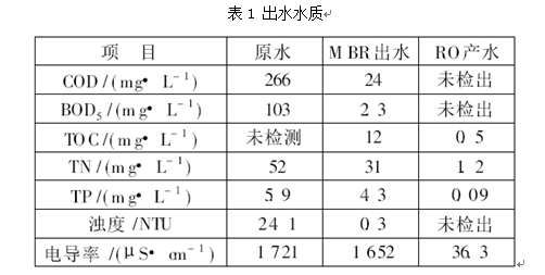 试验期间,MBR系统和RO系统运行良好,对污染物的去除效果稳定,其出水水质如表1(表中数据均为平均值)所示。