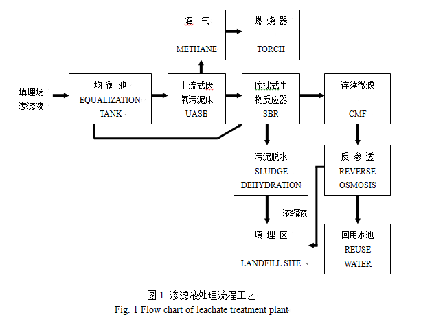 广州市兴丰生活垃圾填埋场是目前国内仅有的几家采用膜法深度处理工艺处理垃圾渗滤液用于回用的填埋场之一,运营单位为惠民(广州)环境技术有限公司(Onxy)。该渗滤液处理系统采用了目前国内最为先进的厌氧、好氧和膜技术组合工艺,其单元流程如图1: