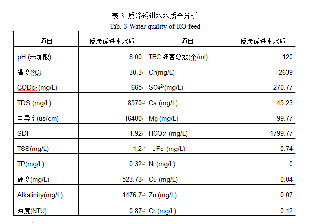 经过UASB、SBR、CMF预处理后的反渗透进水水质大致如表3所示。该数据为2006年8月Filmtec反渗透膜元件投运时取样结果,但要注意渗滤液水质受到降雨等因素影响波动较大,尤其是TDS, COD等值。