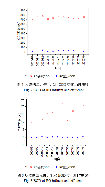 经过11个月的运行和监测,证实反渗透对于总溶解固体、COD、和BOD都具有较好的脱除效果。其平均脱除效果如图2、3所示。结合表2 中各阶段出水水质平均值,证实反渗透对于COD和BOD的脱除率能达到98%以上。
