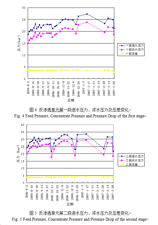 图4和图5是对反渗透单元第一和第二段进水压力、浓水压力及压差变化的记录。从两张图中可以看出,最初安装的一个月内,两段的进水压力分别显著上升,之后稳定下来。这是新安装膜元件在非常高进水COD值下,表面被有机物附着污堵所致。此后,由于冬季温度下降,系统运行温度降低,两段运行压力均逐渐上升,07年三月之后系统运行压力又有所下降。从图中还可以看出,两段反渗透的进水/浓水压差一直保持在一个稳定的水平,表明通过有规律的对反渗透单元进行清洗,系统的污堵程度始终被控制在较小的范围内。