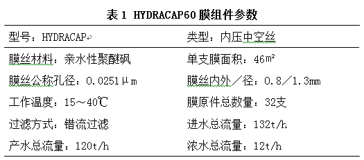 文登热电厂一期工程安装6MW机组一台,一台出力35t/h的循环流化床锅炉。主要为冬季采暖期提供热源。锅炉补给水系统采用预处理+二级RO,系统出力83t/h。主要水源为河水,城市自来水作为备用水源。河水丰水期与枯水期水质变化很大??悸堑絉O系统安全稳定运行的需要,预处理系统采用全自动净水装置+UF。全自动净水装置相当于小型的澄清池,对河水进行混凝沉降处理,其出水浊度可小于10NTU。UF采用美国海德能公司的HYDRA—CAP60膜组件,具体参数,见表1。